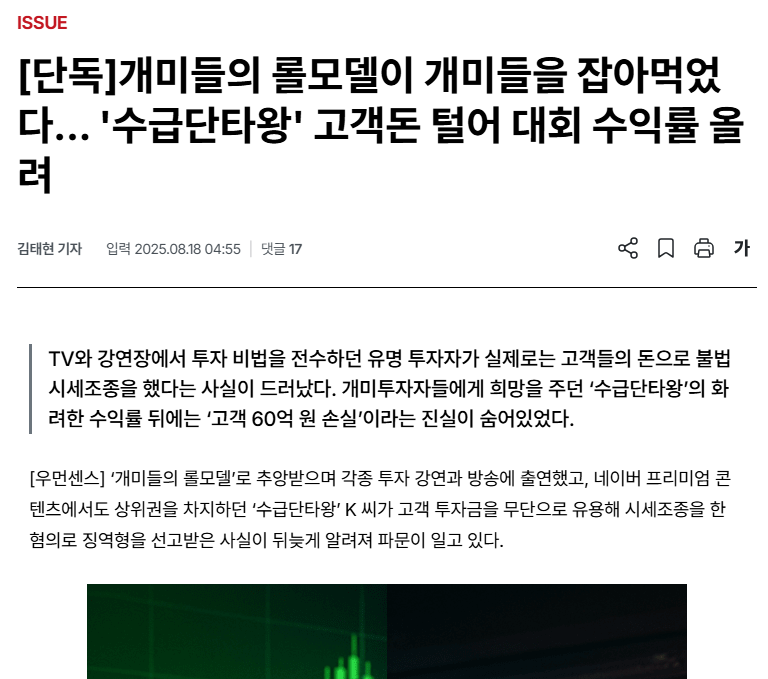 최근에는 수급단타왕이라는 사람이 사고 친게 갑자기 뜬것 같던데[단독]개미들의 롤모델이 개미들을 잡아먹었다... '수급단타왕' 고객돈 털어 대회 수익률 올려 < ISSUE < 기사본문 - 우먼센스