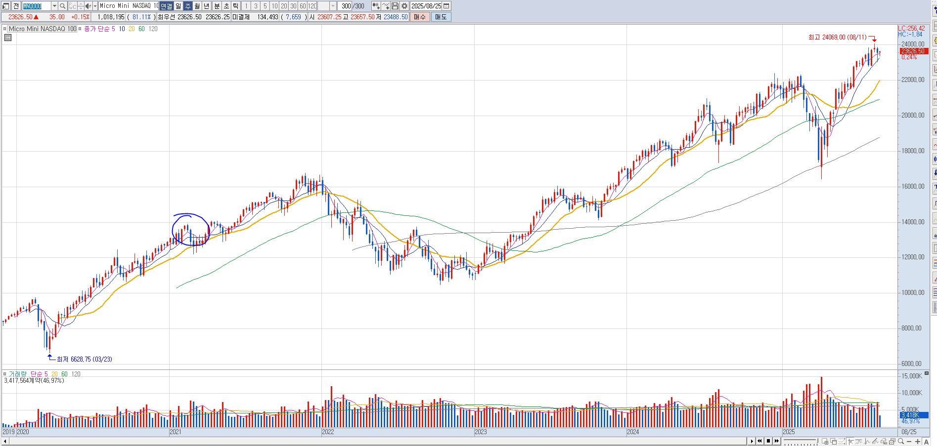 나스닥은 지금 위치가 왼쪽 동그라미 부분이라고 봤음