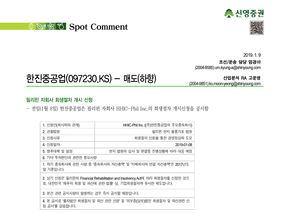 신영증권의 한진중공업 매도. 근거는 필리핀 자회사의 파산 ... 이정도는 되어야 매도지..ㅋㅋ??