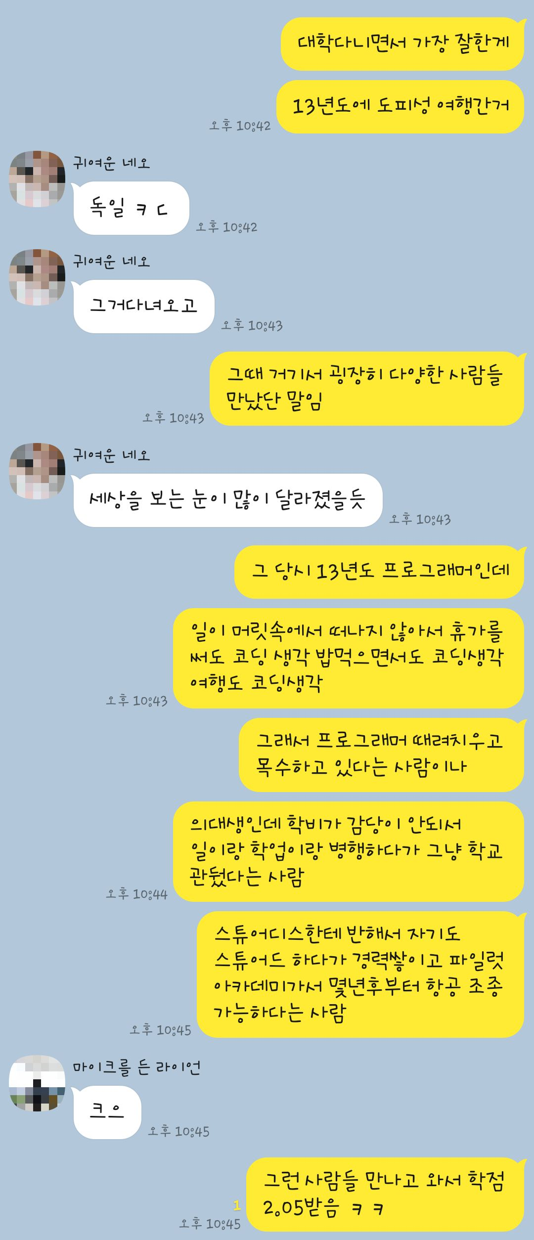 대학간걸 후회하지는 않는데 어차피 이렇게 될 줄 알았으면 대학을 한 3년이나 2년만 다녀도 되지 않았을까 하는 아쉬움이 많이 남음.