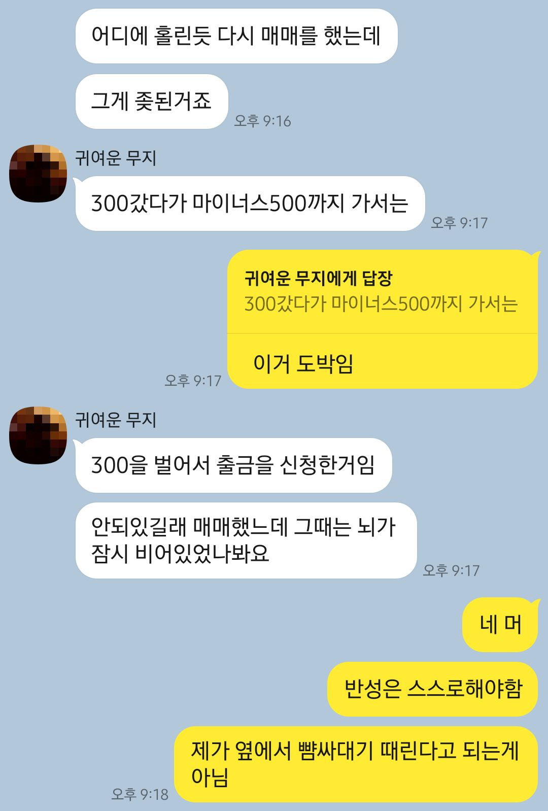 귀여운 무지 내가 귀여운 무지를 좀 구박했는데 한 1억을 운용하면서 +300에서 -500을 갔다가 0에 오면 그냥 변동성을 견딘것 (못먹은것) 뿐임. 그런데 전 재산이 한 1000 정도 있는데 저런 변동성에서 대응이 없었다면 그냥 도박한거임.
