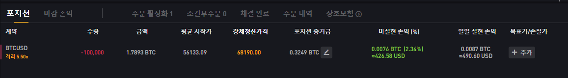 55.565k에서 1억 공매도였고 이 포지션은 최대 -4,500 달러까지 갔었음