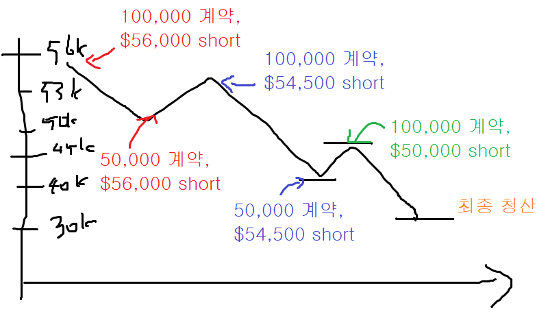 예를 들어서 56k에서 30k까지 무적권 숏이다. 하고 10만계약 숏베팅을 했다가 막상 51k 쯤에서 잠시 주춤하면 아 반등 한 2,000달러 나오겠다 하면서 한 5만 계약을 커버링하는데 처음 계획대로 30k까지 끌고가려면 51k 위에서는 같은 51k라도 이 물량을 들고가야한단말임.