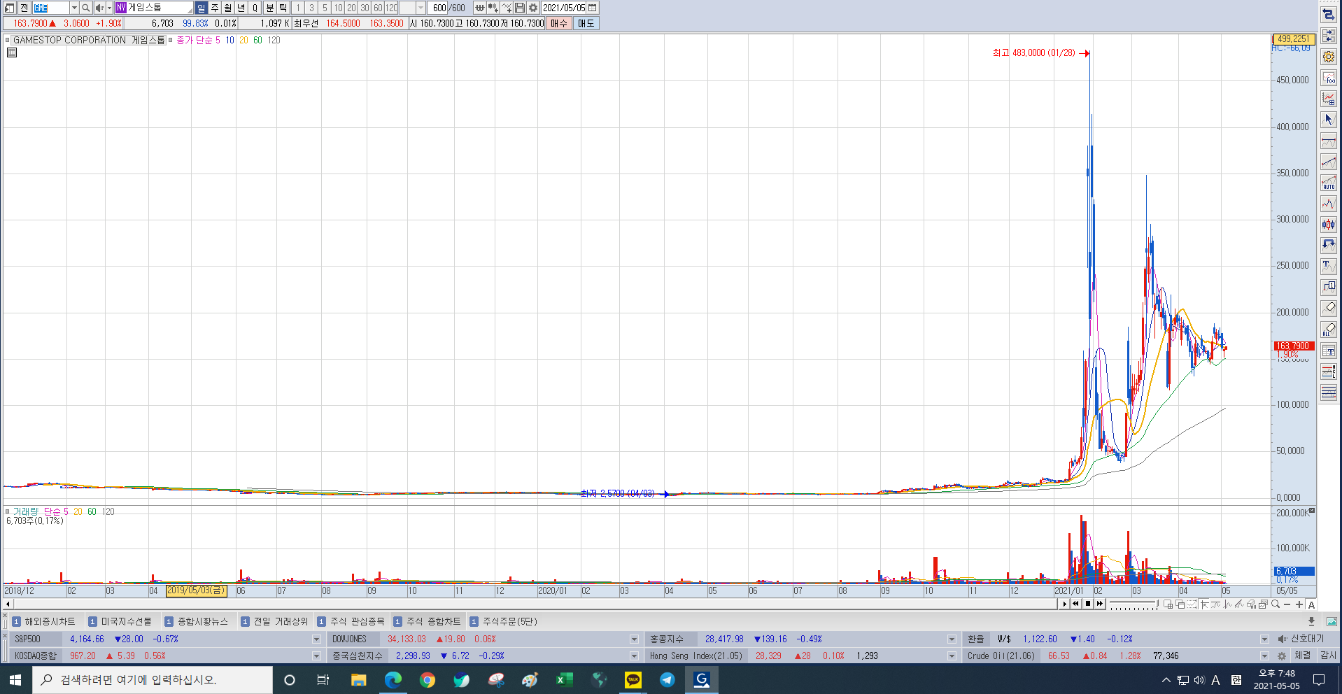지금은 GME, 게임스탑 차트를 참고하고 있음. 보통 이런 굵직굵직한 금융 시장내에서 파생된 대형 테마주