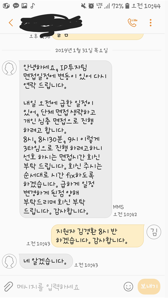 만약 출근하게 되면 최저임금으로 6개월 인턴하고 정규직으로 채용이 될 것이다. 언제쯤 출근 가능하냐. (2월 7일 NH붙으면 2월 14일 면접보니까) 설 지나고 분당에서 신상 정리할 시간 1주일만 주십쇼. 아 그럼 2월 15일날 연락드리겠다. 아멘 땡큐.