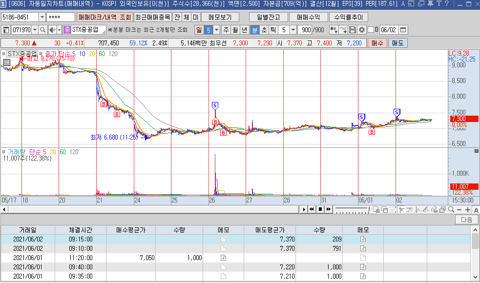 가령 처음 7700원에 쳐 물린거 가만히 존버 안하고 고점에 좀 팔고 밑에서 다시 잡고 위에서 좀 팔고 밑에서 다시 잡고. 어쨌든 계좌에는 마이너스가 찍히긴 하는데 처음 존버한거에 비해서는 평단이 유리해짐