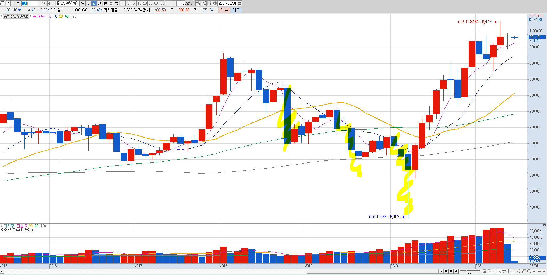 그럴때 바닥에서 사서 월봉의 끝까지, 혹은 적당히 어깨쯤에 매도하는게 가장 '돈이 잘 벌어짐'