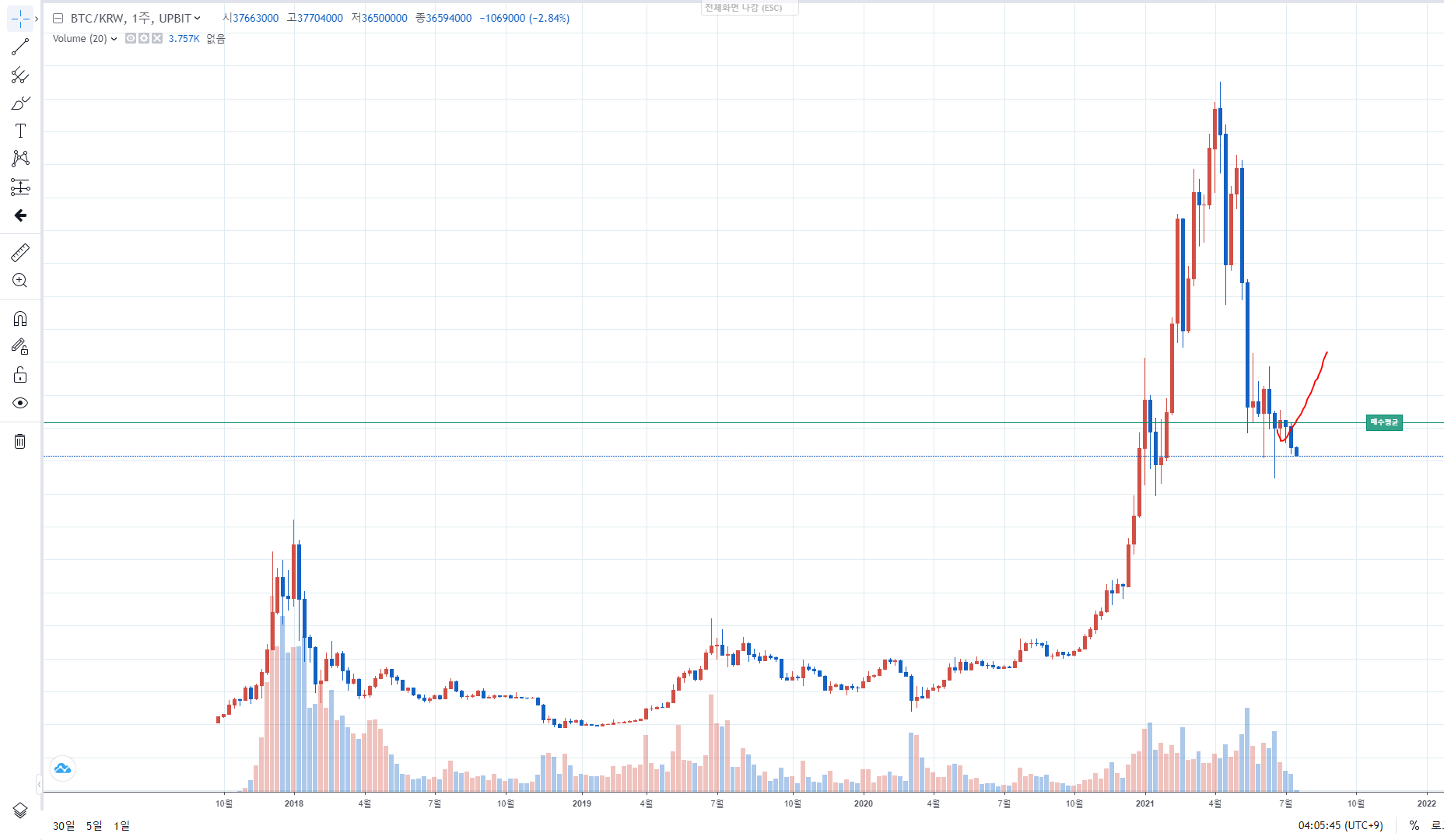 기존 시나리오는 7월 초중순에 한 10% 빠지는 급락 보여주고 아무도 매수 못하게 만든 상태로 눌림없이 어어어 하다가 6000만원~ 신고가 향해 달리는건데 차트가 좀 망가졌음.