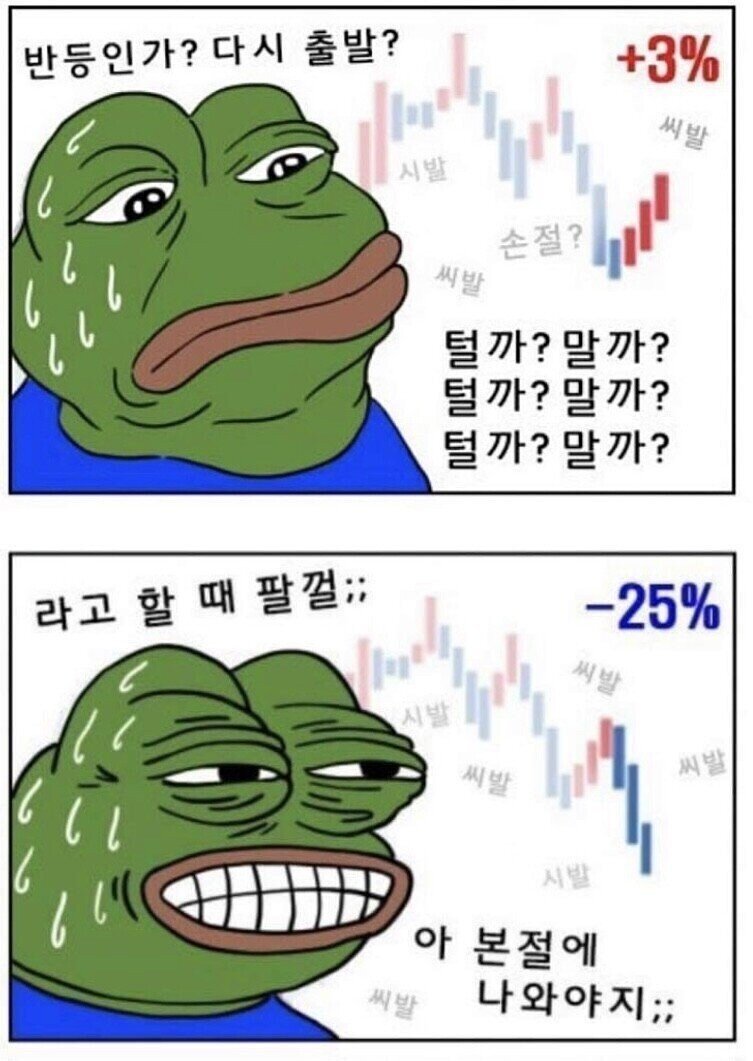 본전만 본전만 하다가 결국 할때 팔걸 할때 팔걸 하면서 10월 4일 빨간불이 10월 5일 11시쯤 파란불로 바뀔때 매도가 나갈거임.