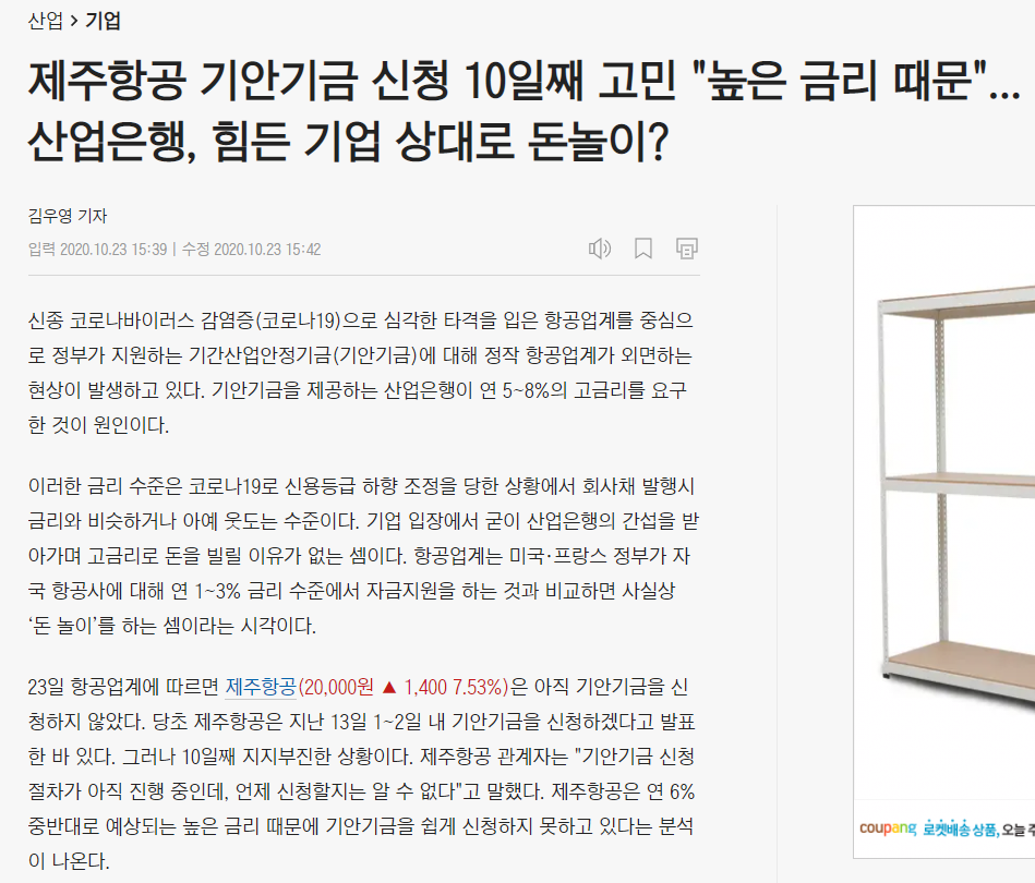 https://biz.chosun.com/site/data/html_dir/2020/10/23/2020102302009.html제주항공 기안기금 신청 10일째 고민 "높은 금리 때문"... 산업은행, 힘든 기업 상대로 돈놀이?