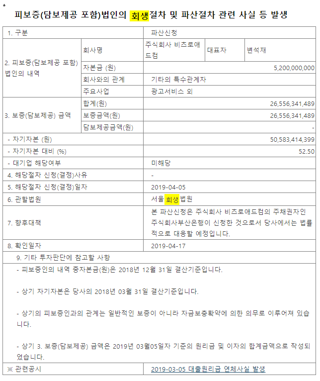 거래가 정지되고 파산절차를 거쳤다.