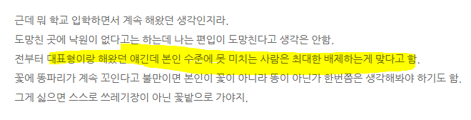꽃에는 나비가 꼬이고 똥에는 파리가 꼬이는데 내 주변에 파리밖에 없으면 난 꽃이 아니라 똥이라는 말에 좀 충격받았나봄 ㅋㅋ