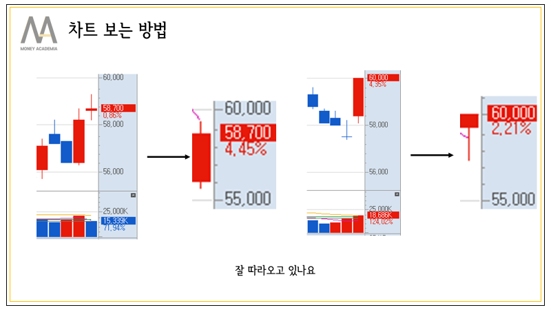 '잘 따라오고 있나요' ㅋㅋ 그냥 빨간봉 좋은거 파란봉 안좋은거 이게 아니라 저런 원리가 숨어있었고 저걸 이해해야 주가 상승의 원리 - 누군가의 시장가 매수 - 를 납득할 수 있는거임.