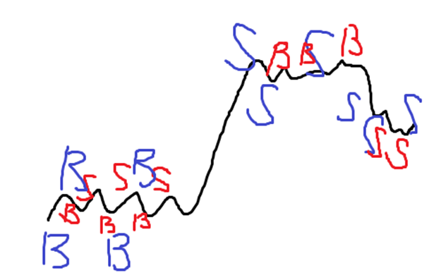우리 같은 개인들은 천만원씩 빨간색으로 사고 팔고 하는데 기관은 100억씩 파란색으로 사고 팔고 해. 그러다보니 1년간 긴 호흡으로 100억으로 20% 수익나면 20억 버는건데 우리는 1주일만에 5% 수익나서 50만원 버는거지.